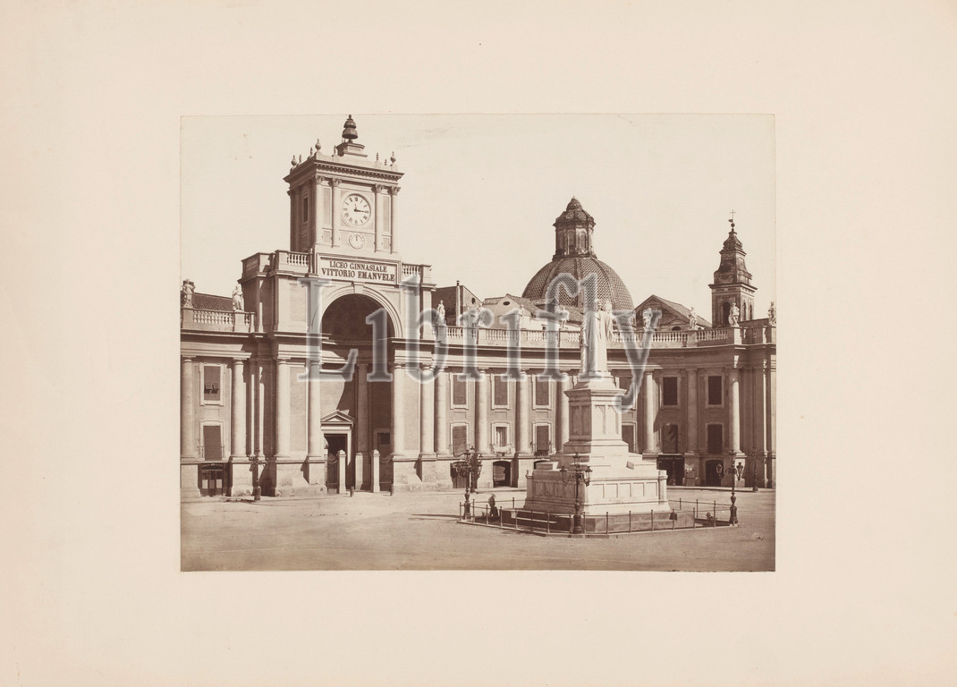 Statue, Dante, Piazza Dante, Naples, Italy, Piazza Dante, Napoli, series title, Giorgio Sommer, Tito Angelini, Naples, 1871, 1914, cardboard, paper, albumen print, height 318 mm, width 445 mm