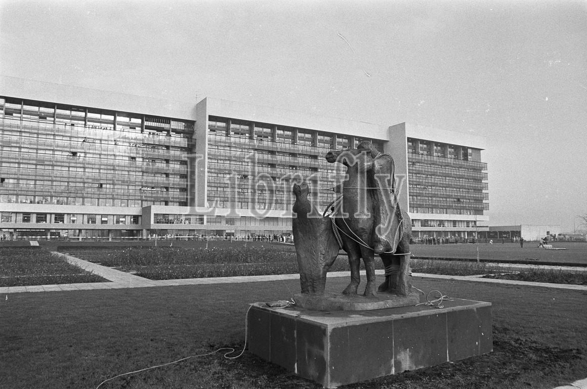 Statue, St, Elisabeth, rose miracle, Mari Andriessen, placed, helicopter, new St, Elisabeth Hospital, Haarlem, 7 December 1971, Netherlands, 20th century, press agency photo, news to remember, documentary, historic photography, 1945-1990, visual stories, human history, Twentieth Century, moments in time