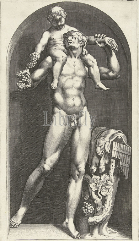 Statue, faun, Bacchus, shoulders, Cornelis Cort, c, 1570 - c, 1575, faun stands, niche, carries, young Bacchus, shoulders, left, tree stump, skin, buck, pan flute, print maker, Cornelis Cort, mentioned, object, Rome, c, 1570 - c, 1575, paper, engraving, h 376 mm × w 195 mm