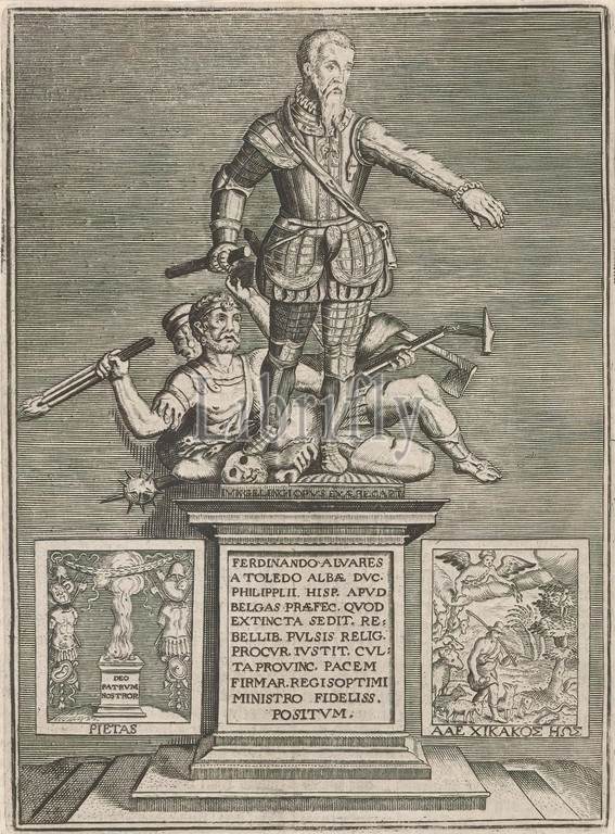 Statue Ferdinand de Toledo, Duke, Alva, statue, Duke, Alva, erected, courtyard, citadel, Antwerp, 1571, feet, two-headed figure, four arms, Left, right, two representations, sides, pedestal, print maker, anonymous, print maker, Philips Galle, copy, sculpture, Nicolaas Jongelinck, mentioned, object, Amsterdam, 1647, paper, engraving, letterpress printing, height 165 mm × width 121 mm