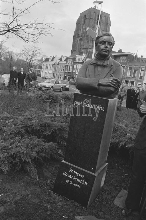 Statue Francois Haverschmidt ( Piet Paaltjens ) unveiled in Leeuwarden by mayor Te Loo, statue Piet Paaltjens, December 10, 1986, Statues, mayors, unveilings, The Netherlands, 20th century press agency photo, news to remember, documentary, historic photography 1945-1990, visual stories, human history of the Twentieth Century, capturing moments in time