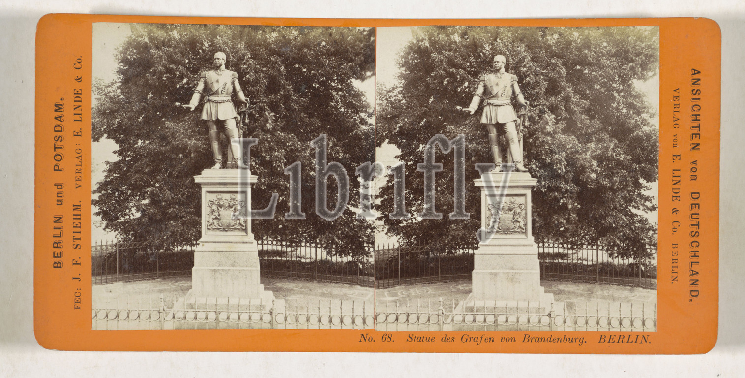 Statue, Friedrich Wilhelm von Brandenburg, Leipziger Platz, Berlin, Statue des Grafen von Brandenburg, Berlin, Ansichten von Deutschland, Berlin und Potsdam, series title, Johann Friedrich Stiehm, mentioned, Hugo Hagen, Leipziger Platz, publisher, Berlin, 1868, 1870, cardboard, paper, albumen print, height 86 mm, width 176 mm
