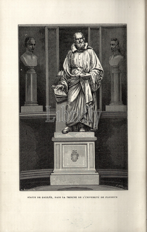 Statue, Galilee, grandstand, University, Florence, Statue, Galileo Galilei, University, Florence pictured, 19th century, signed, H. Rousseau, F. Méaulle, frontispiece, Rousseu, H., Méaulle, F., 1869, Louis Figuier, Vies des savants illustres, depuis l'antiquité jusqu'au dix-neuvième siècle, Paris, librairie internationale, 1869
