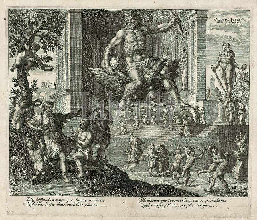 statue, Jupiter, Olympia, seven wonders, world, series title, print maker, Simon van de Passe, mentioned, object, design, Maerten de Vos, mentioned, object, publisher, Crispijn van de Passe, I, mentioned, object, Utrecht, 1614, paper, engraving, height 251 mm × width 320 mm, height 214 mm × width 251 mm