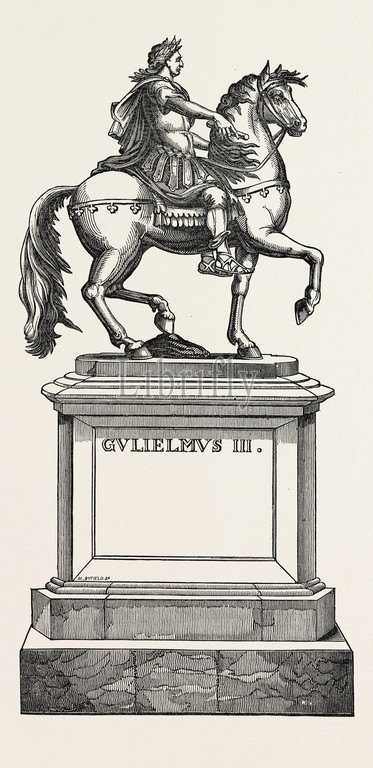 sculpture, monument, statue, king william the third, king william iii, st. james's , public space, square, london, uk, britain, british, europe, united kingdom, great britain, european, engraved image, history, illustrative technique, engravement, 19th century engraving, victorian, arts, culture, 19th century style, retro styled, vintage, retro, arkheia