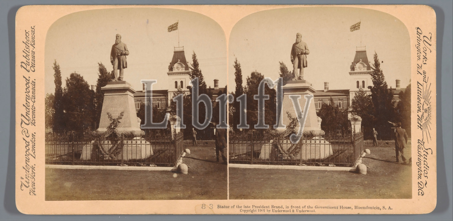 Statue, Late President Fire, front, Government House, Bloemfontein, S, Africa, fire, ablaze, Underwood, 1901
