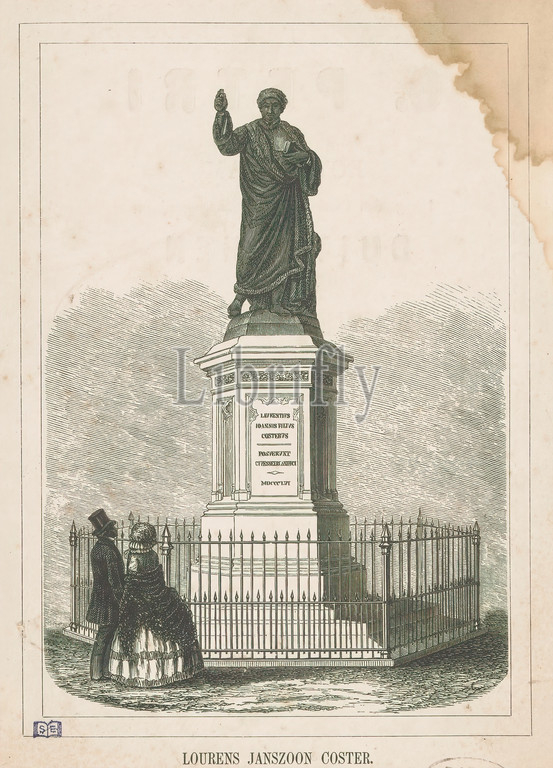 Statue, Laurens Jansz, Coster, Lourens Janszoon Coster, title, object, man, front, woman view, statue, Laurens Jansz, Coster, surrounded, fencing, print maker, anonymous, publisher, Otto Petri, Rotterdam, 1856, 1882, paper, letterpress printing, height 226 mm × width 166 mm