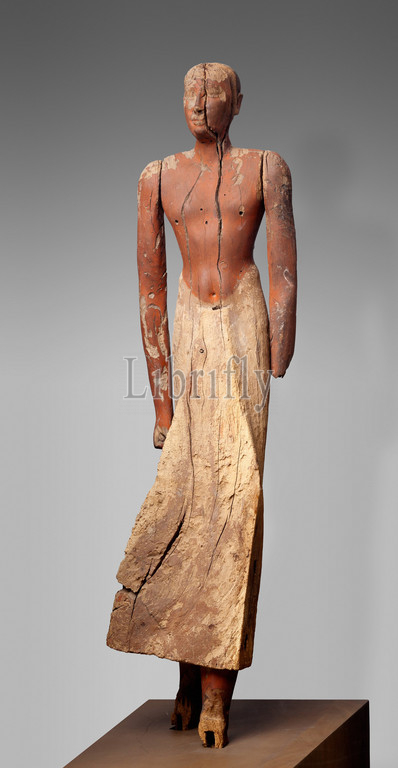 Statue of an official Ihy, Old Kingdom, Dynasty 6-8, ca. 2200–2100 B.C., From Egypt, Memphite Region, Saqqara, Djoser Pyramid precinct, near, Ptolemaic tomb, cache of statues of Ihy, SAE Excavations, Wood, paint, H. 104 cm