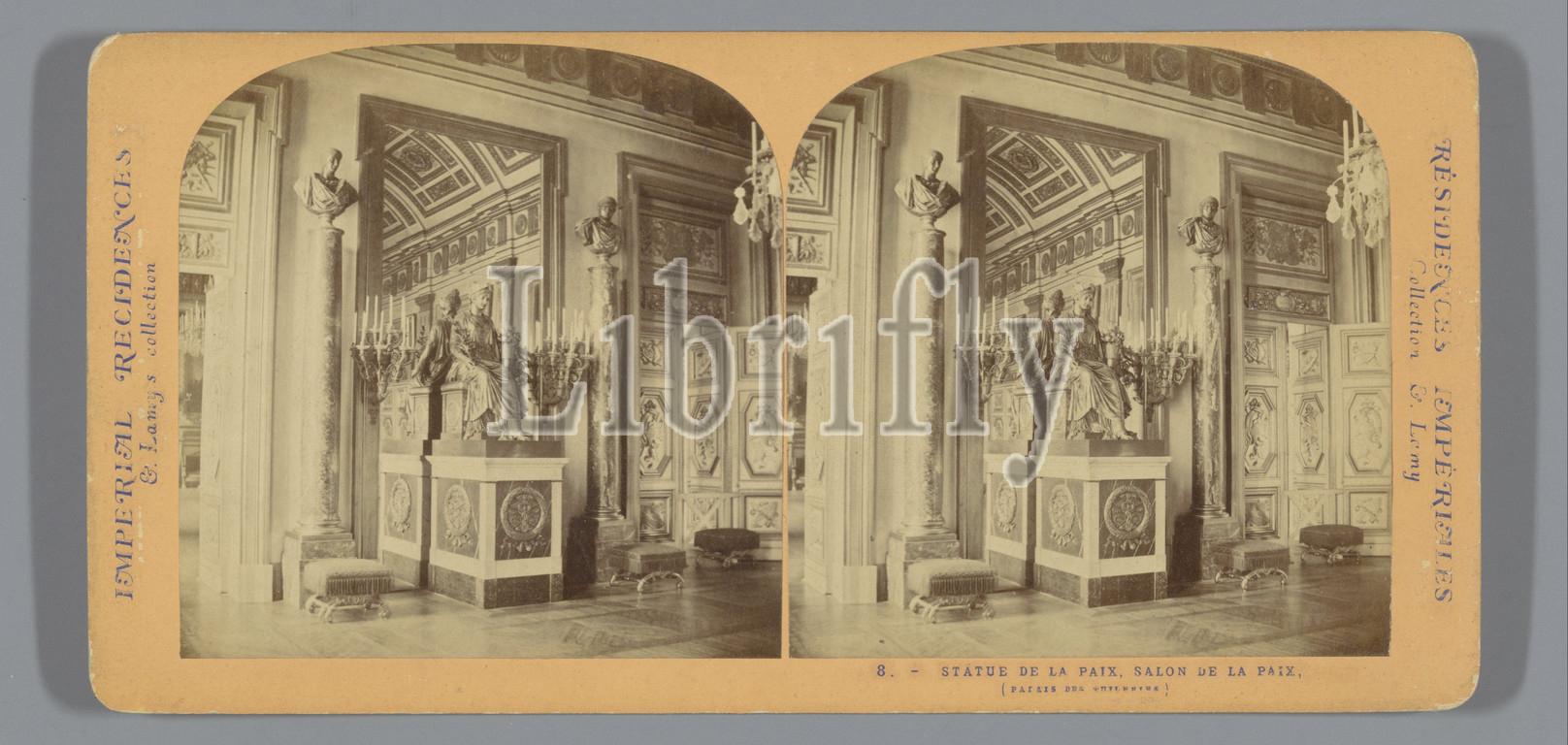 Statue, Salon de la Paix, Palais des Tuileries, Paris, Statue de la Paix, Salon de la Paix, Imperial Residences, series title, Ernest Eléonor Pierre Lamy, mentioned, Tuilerieënpaleis, c, 1860, 1871, cardboard, albumen print, height 85 mm, width 170 mm