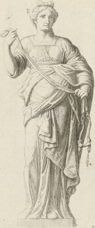 Statue, Temperantia, Temperance, rear façade, City Hall, Dam Square, Hubert Quellinus, Artus Quellinus, I, 1719 - 1783, Statue, Temperantia, personification, Temperance, left, tympanum, rear façade, west side, City Hall, Dam Square, Amsterdam, hands reins, Numbered, lower right, XV, print maker, Hubert Quellinus, Hubert Quellinus, Artus Quellinus, I, Amsterdam, 1663 / 1719 - 1783, paper, etching, engraving, h 320 mm × w 141 mm