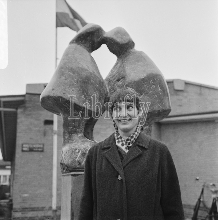 Statue The Twins of sculptor Nel van Lith unveiled at GG and GD on Amstelveenseweg, Nel van Lith (head), December 15, 1967, images, sculptors, unveilings, The Netherlands, 20th century press agency photo, news to remember, documentary, historic photography 1945-1990, visual stories, human history of the Twentieth Century, capturing moments in time