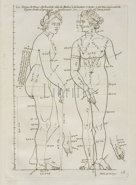 La Statue, de, Venus, Aphrodide, Les proportions, du, corps, humain, mesurées sur, les, plus, belles, figures, de, l'antiquité, Audran, Gérard, 1640-1703, Etching, 1683, Plate 15, depicting views, statue, Venus Aphrodite, Plates 1-30, illustrate, human, proportions, measured, antique statues, Laocoon, Farnese Hercules, statue, Pyramus, Ludovici Collection