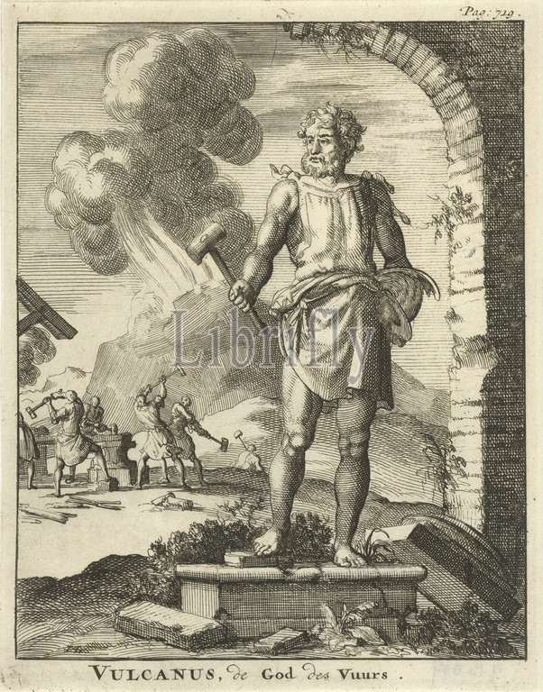 Statue, Vulcan Vulcan, God, Fire, title, object, Print upper right, Pag, 719, story, Vulcan, Hephaestus, statues, paintings, etc, objects, worship, Roman religion, smith, blacksmith, Jan Luyken, mentioned, Amsterdam, 1686, paper, etching