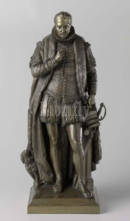 Statue of William of Orange Statue of William of Orange Statue of Willem van Oranje, Bronze statue full of Willem van Oranje. Dressed in official clothing leaning against a pillar. His left hand rests on a sealed document. His sword stands against the pillar. On his right foot is a dog that looks up at him, historical persons, Willem I (Prince of Orange), Louis Royer, Amsterdam, c. 1848 - c. 1851, bronze (metal), founding, h 48 cm × w 20 cm × d 16.5 cm w 17.1 cm