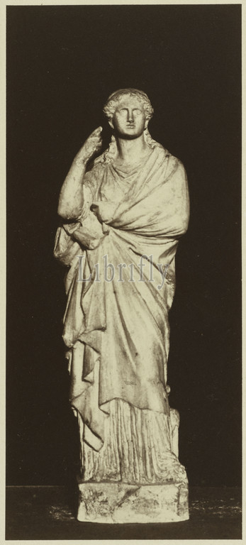 Statue of a woman, allegory in the antique style, pointing to the sky by Georges Diébolt (1816-1861)., Anonymous, Photographer, Vers 1855, Photography, Dimensions - Work: Height: 18.5 cm, Width: 8.2 cm, Dimensions - Montage: Height: 47.5 cm, Width: 31.1 cm, Dimensions: Height: 50 cm, Width: 40 cm