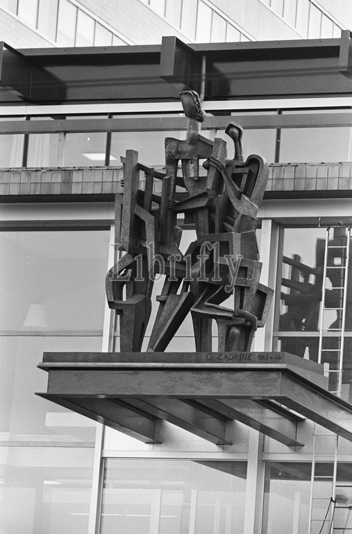 Statue by Zadkine unveiled in front of building Dutch Bank Frederiksplein. The statue La Demeure, November 27, 1967, images, buildings, unveilings, The Netherlands, 20th century press agency photo, news to remember, documentary, historic photography 1945-1990, visual stories, human history of the Twentieth Century, capturing moments in time