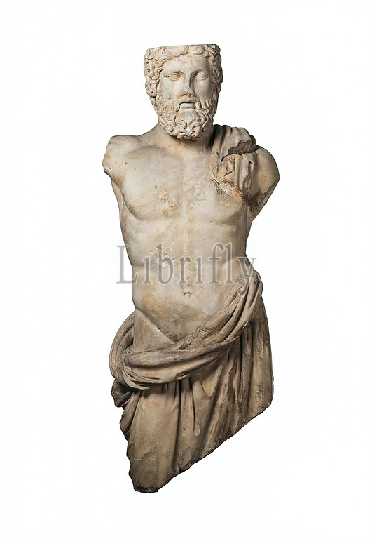 Statue, Zeus, Poseidon, property, Stiftung Hamburger Kunstsammlungen, St, marble, chiseled, drilled, marble, Depth, three-dimensional sculptures, sculptures, fountains, water, history, Jupiter, Zeus, history, Neptune, Poseidon, torso, torso, gods, classic, Mythology, Early Imperial Era, Roman Antiquity, Depicted, bearded god, light screaming position, right leg, set, little, side, in front, sculpture, composed, several fragments, lower part, separately attached arms, statue support, skull cap, missing, mantle cloth, wrapped, hips, slipped down, right side, figure, rises, back, small puff hangs down, left shoulder, upper edge, cloak, turned, bulge rising, left side, body, dowel hole, base, left arm, two, base, left hip, deduced, bead, robe, passed, raised left arm, arm, piece, coat, separate piece, marble, right arm, according, identification, shoulder, led, side, upwards, held, staff, scepter, head showed strong, long strands, hair, well, finely shaped voluminous beard, turned, little, left side, small mouth, open, design resembles, head, 'Dresden Zeus', muscular body, precisely formed, fine swing due, standing, playing leg, well, opposing shoulders, head, based, Greek models, body, mantle, Hellenistic, Whether, copy, eclectic new creation, difficult, decide, statue originally, sculptural equipment, Roman thermal bath, according, identification, channel, ancient water pipe running, right hip, antique fountain figure, placed, niche, unprocessed back, statue, supply pipe remained hidden, viewer, dowel hole, back, head, served, attach, back wall, fountain figure, Poseidon, reference, Zeus type, Zeus, statue support, left side, body, carved, shape, dolphin, gargoyle, raised right side, trident, added, motif, represented, 'Poseidon, Melos' in, National Museum, Athens, modified Zeus