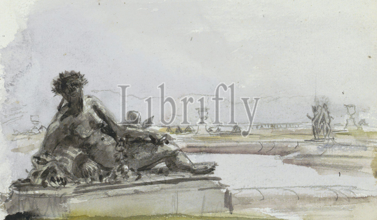statues, Parterre d'Eau, Page 17, sketchbook, 18 pages, Statue, water nymph, garden, Versailles, draughtsman, Marius Bauer, Versailles, 1920, brush, Marius Bauer, 1920