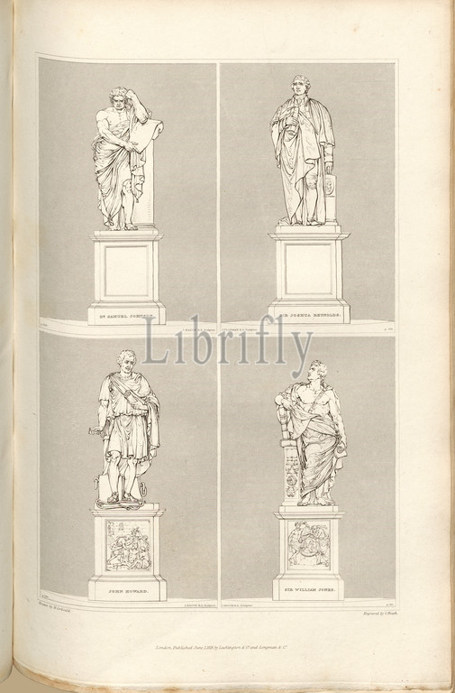 Statues of Dr. Samuel Johnson, Sir Joshua Reynolds, Mr. Howard, and Sir William Jones, Statues from St. Paul's Cathedral in London, signed: Drawn by H. Corbould; Engraved by C. Heath; Published by Lackington & Co. and Longman & Co., Pl. LI, p. 200, Corbould, H. (drawing); Heath, C. (engraving); Lackington & Co. (publ.); Longman & Co. (publ.), William Dugdale, Henry Ellis: The history of Saint Paul's Cathedral in London, from its foundation: extracted out of original charters, records, leiger-books, and other manuscripts. London: printed for Lackington, Hughes, Harding, Mavor, and Jones; and Longman, Hurst, Rees, Orme, and Brown, 1818