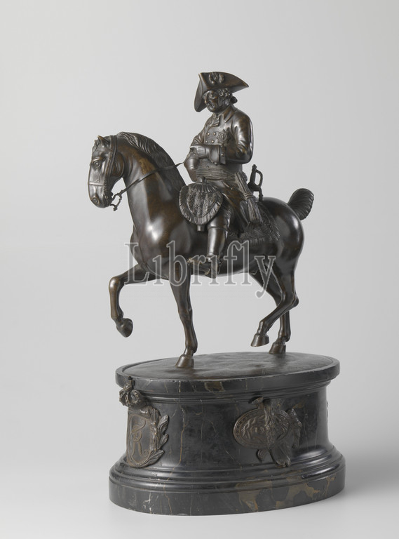 Statuette of Frederick the Great, King of Prussia Statue of Frederick the Great, King of Prussia, The king (1712-1786) sits on a step-by-step horse that has lifted the right foreleg and the left hind leg for a moment ground light, the head is turned slightly to the right. He holds the rein with one hand, while the other rests in the side. He wears a uniform consisting of a jacket with a jabot, gloves and boots, on the head a wig and, on the jacket, place the Order of the Black Eagle, a sash around the waist, a sword and a sword on the left. The saddle, with rider pistols on both sides in holsters under a flap, is placed on a schabrak, which, like the holster flap, is decorated with Louis XV-style C-volutes and with frills. The horse, wearing a head harness, is connected to the ground, an oval plate, sunk into a profiled marble pedestal. This shows bronze decorations on four sides: on the front a cartouche with the monogram F [redericus] R [ex] surrounded by two palm leaves, above which the royal crown, on one side a winch over a music book and a flute with a laurel wreath across it, on the other side a shield with Medusa head, including a helmet and sword, the grip of which has an eagle's head, a laurel wreath overall, on the back a horn of abundance with ears of corn by a band connected to a raised leafy branch, historical persons, Frederick II (King of Prussia), Emanuel Bardou, Berlin, 1778 - 1779, bronze (metal), marble (rock), h 51 cm × w 30.5 cm × d 21.5 cm w 28 cm × d 21.5 cm