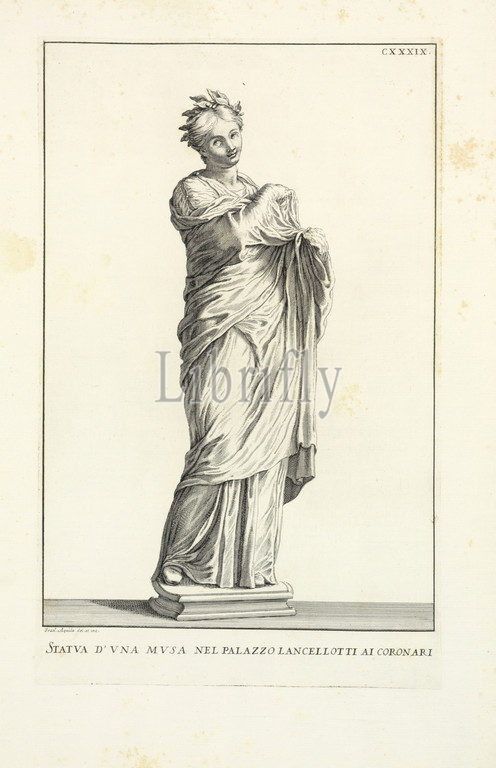 Statva d'vna, mvsa, nel, Palazzo, Lancellotti, ai, Coronari, Raccolta di, statue, antiche, moderne, Aquila, Francesco Faraone, 1676-1740, Rossi, Domenico de, 17th/18th cent., Zenobi, Gaetano, fl, 1698-1707, Engraving, 1704, Lower left, Fran.o Aquila, del, et inc