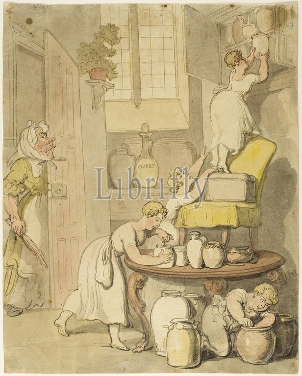 Stealing the Preserves, 1815/20, Thomas Rowlandson, English, 1756-1827, England, Pen and red and black ink, with brush and watercolor, over traces of graphite, on ivory wove paper tipped onto cream wove paper, 275 × 220 mm