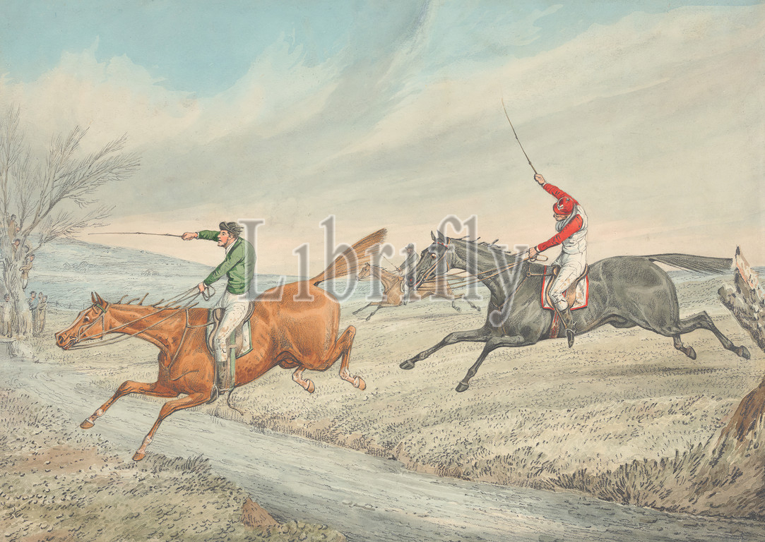 Steeplechasing: Three Riders Taking a Brook, Henry Thomas Alken, 1785–1851, British, ca. 1825, Graphite and watercolor on moderately thick, moderately textured, blued white, wove paper, Sheet: 10 1/4 × 14 3/8 inches (26 × 36.5 cm), brook, horse racing, horseback riders, horseback riding, horses (animals), jockeys, jumping, landscape, men, race (event), spectators, sporting art, tree, whips (animal equipment)