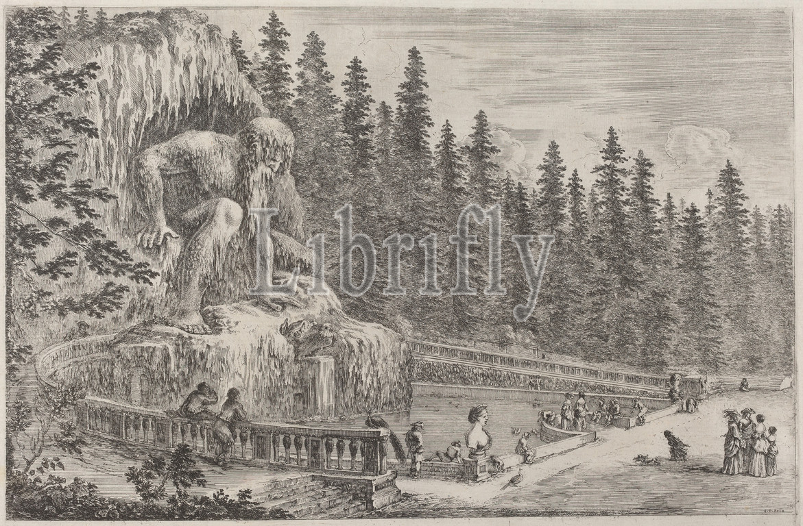 Stefano Della Bella, (artist), Florentine, 1610 - 1664, Colossal Statue of the Apennines, Views of the Villa of Pratolino, (series), probably 1653, etching, sheet: 29.7 × 42.5 cm (11 11/16 × 16 3/4 in.), plate: 26.7 × 39.4 cm (10 1/2 × 15 1/2 in.)