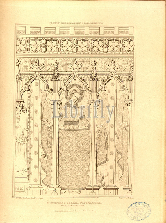 St. Stephen's Chapel, Westminster, compartment on one side, St Stephen's Chapel at the Palace of Westminster in London, signed: Drawn by W.H. Bartlett, from a Sketch by I. Carter; Engraved by J. Le Keux; Published by Longman & Co, Fig. 66, p. 260, Carter, I. (sketch); Bartlett, William Henry (drawing); Keux, John Le (engraving); Longman & Co. (published), 1825, John Britton: The architectural antiquities of Great Britain: represented and illustrated in a series of views, elevations, plans, sections and details of various ancient English edifices: with historical and descriptive accounts of each. Bd. 5. London: J. Taylor, 1807-1826