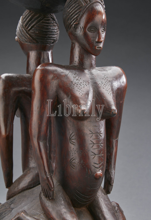 stool with janus female figures, Zela, early 20th century, wood, 15-1/8 x 9 x 9 in., African Art