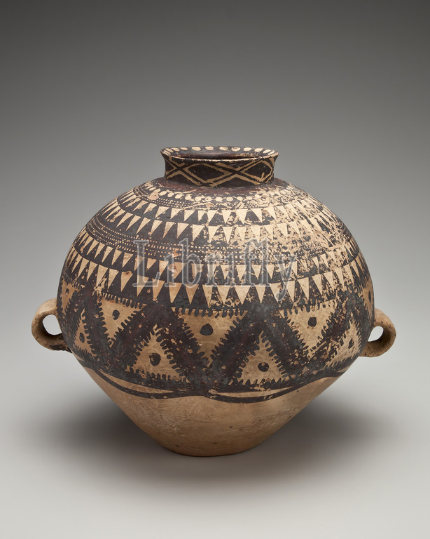 storage jar, triangle bands, chevron, dot design, Neolithic, pre-4th century B.C.E., partially burnished earthenware, paint, 8-5/8 x 11-1/4 x 9-1/2, Asian Art
