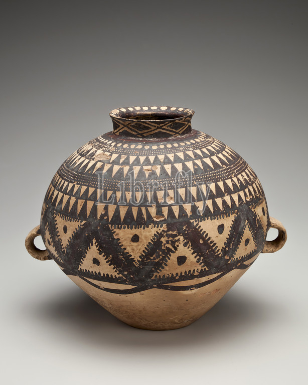 storage jar, triangle bands, chevron, dot design, Neolithic, pre-4th century B.C.E., partially burnished earthenware, paint, 8-5/8 x 11-1/4 x 9-1/2, Asian Art