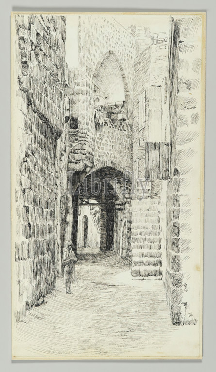 Street, Jaffa, Life, Our Lord Jesus Christ, La Vie de Notre-Seigneur Jésus-Christ, James Tissot, French, 1836-1902, Pen, ink, paper mounted, board, 1886-1887, 1889, Sheet, 8 1/4 x 4 1/2, 21 x 11.4 cm, alley, alone, arches, brick walls, brickwork, drawing, empty, French, holy land, IMLS, ink, israel, jaffa, paper, pen, ink, religious art, sketch, street, tissot