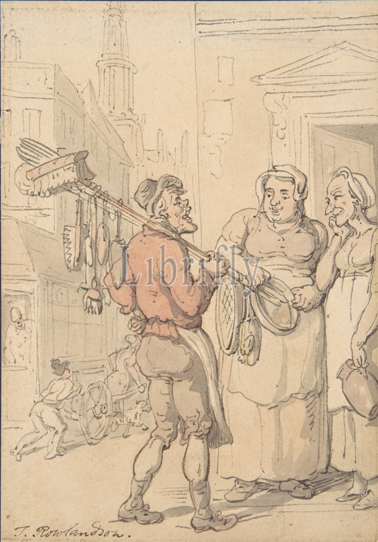 Street Scene, Vendor, Brushes, 1780–1827, Watercolor, Sheet, 4 15/16 x 3 7/16, 12.6 8.8 cm, Drawings, Thomas Rowlandson, British, London, 1757–1827