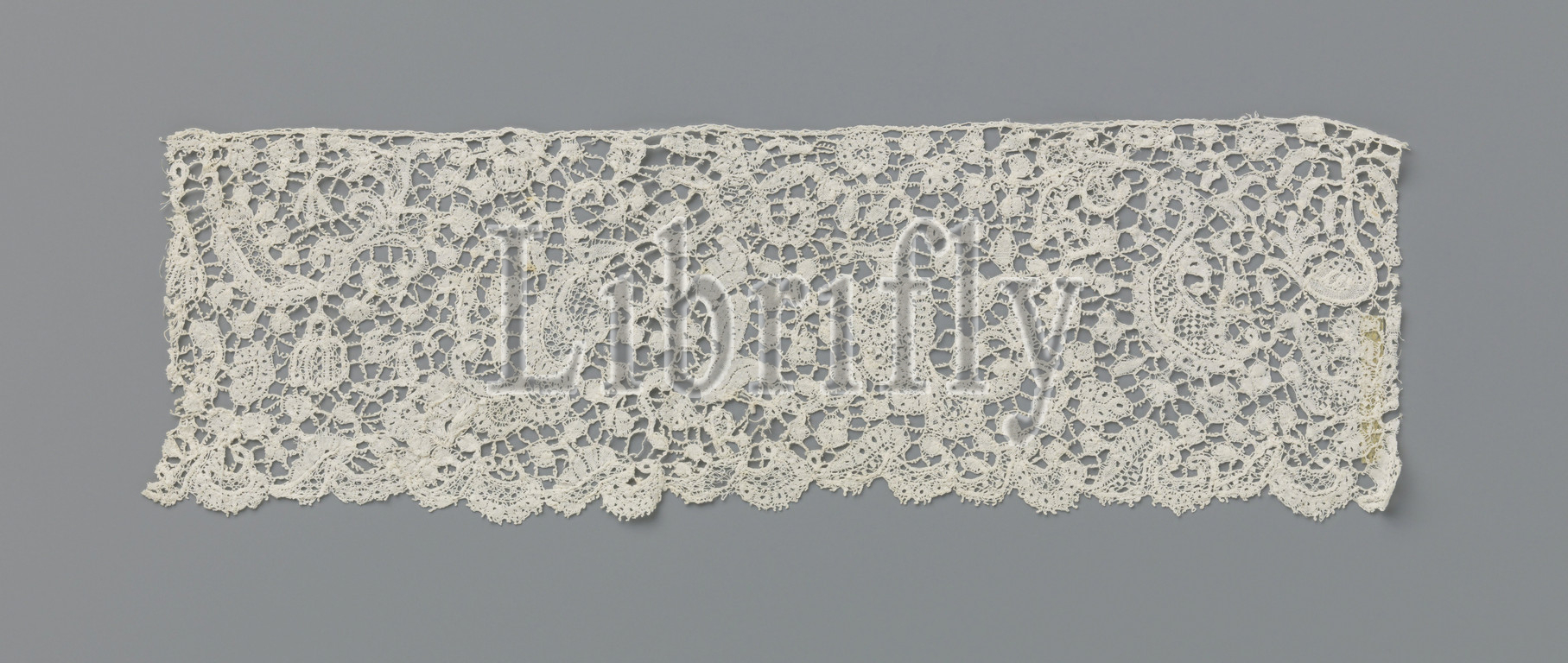 Strip, bobbin lace, female breast statue, natural-colored Brussels bobbin lace, pattern consists, small motifs, whereby, female breast figure stands out, middle, underside, mostly c-shaped motifs, linked together, form, edge, scallops, motifs, connected, pictured braids, linen, cut-outs, partly, open-worked edges, clotted relief contours, Various decorative grounds, decorative ground, squares, shape, top, finished straight, bottom, finished, picots, Brussels, c, 1700, 1724, material, Brussels bobbin lace, l 22