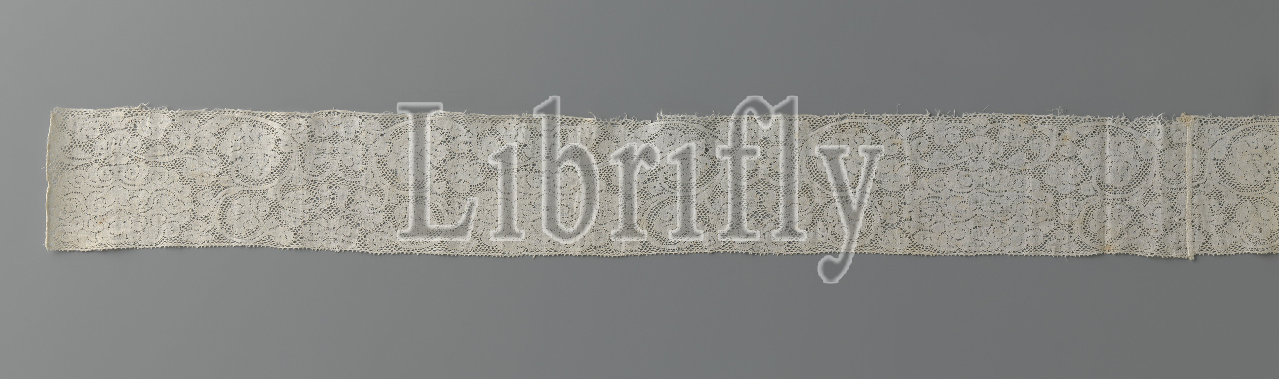 Strip, bobbin lace, large, small peonies, s-volute drinks, natural-colored Dutch bobbin lace, repetitive, symmetrical pattern consists, large peony, smaller peonies, curling side stems, motifs, linen, openwork edges, ensure, drawing, flowers, connected, lattice ground, braiding layers, top, bottom, strip, straight finished, bottom provided, picots, Southern Netherlands, c, 1650, 1660, material, l 125