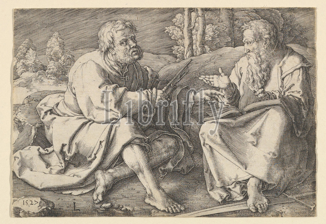 Sts, Peter, Paul Seated, Landscape, 1527, Engraving, sheet, 5 11/16 x 3 15/16, 14.4 10 cm, Prints, Lucas van Leyden, Netherlandish, Leiden ca., 1494–1533, Leiden