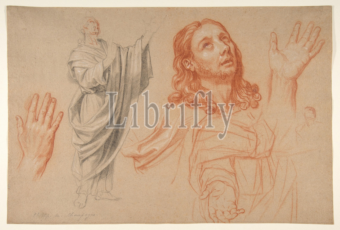 Studies for 'The Conversion of the Jailer before Saint Paul and Silas', 1666, Red, black, and white chalks on buff paper, 11 1/8 x 16 5/8 in. (28.4 x 42.3 cm), Drawings, Nicolas de Plattemontagne (French, Paris 1631–1706 Paris), Nicolas de Plattemontagne's stylistic affinities with his teacher, Philippe de Champaigne, have resulted in misattributions, as seen in the inscription on this sheet. Both artists excelled in painting portraits and religious subjects, and this drawing demonstrates Plattemontagne's interest in giving portraitlike specificity to the actor's in his biblical dramas