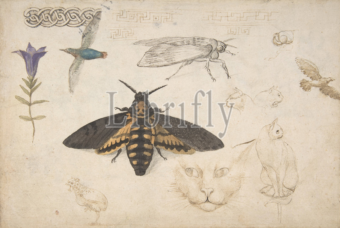 Studies, Gentian, Moth, Birds, Cats, Interlacing Motif, Greek Frets, recto, Ornamental Studies, Figures, verso, 1530–40, Pen, two colors, brown ink, brush, watercolor, leadpoint, black chalk, pen, light brown, 7 3/16 x 10 7/16, 18.2 26.5 cm, Drawings, Giorgio di Giovanni, 'Giorgio da Siena', Italian, documented Siena, 1538–died, 1559, Siena, range, delicately drawn, animal, insect, ornamental motifs, indicates, sheet, part, sketch book, model, imagery relates, generally, fresco cycle, Villa Belcaro, artist executed, 1530, 1540, leading practitioner, genre, naturalistic Antique-style, ornamental, painting