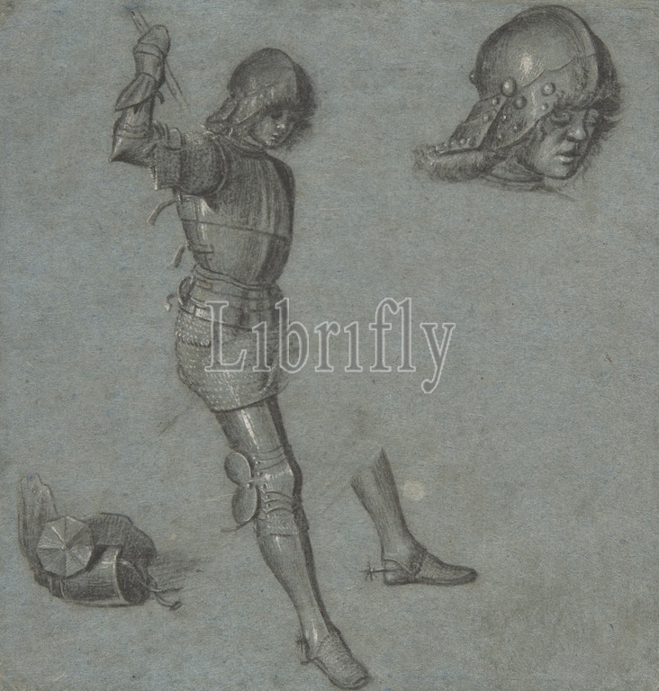 Studies, Seated Youth, Armor, ca, 1505, Point, brush, gray wash, highlighted, white gouache, blue paper, 7 1/2 x 7 1/16in, 19 18cm, Drawings, Vittore Carpaccio, Italian, Venice, 1460/66?–1525/26 Venice, celebrated, drawing, depicts, young model, dressed, armor, positioned, horseback, right arm, raised, holding, shaft, spear, gloved hand, figure, supplemented, upper right, study, helmet, lower left, detail