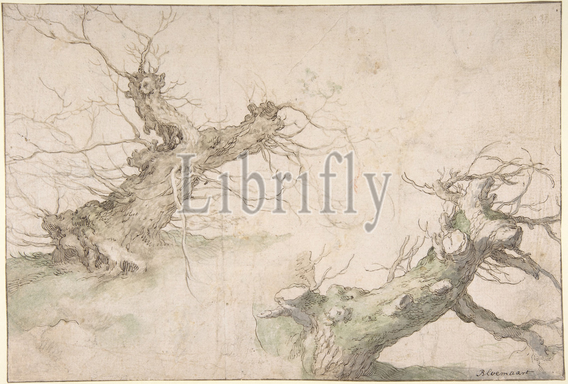 Studies of Two Pollard Willows; Verso: Wide Landscape Prospect, late 16th–mid-17th century, Pen and brown ink, watercolor, traces of black chalk, framing line in pen and brown ink; verso black chalk and watercolor, 8 1/4 x 12 3/16 in. (21 x 31 cm), Drawings, Abraham Bloemaert (Netherlandish, Gorinchem 1566–1651 Utrecht)