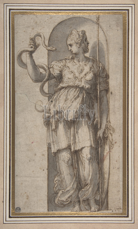 Study, Allegorical Figure, Prudence, 1501–47, Pen, brown ink, brush, gray wash, traces, black chalk, 10 1/16 x 5 9/16in, 25.6 14.1cm, Drawings, Perino del Vaga, Pietro Buonaccorsi, Italian, Florence, 1501–1547, Rome, drawing, graceful figure, diaphanous, billowing drapery, relates, fresco, Sala Paolina, papal reception, hall, Castel Sant’Angelo, decorated, Perino, workshop, 1543, 1548