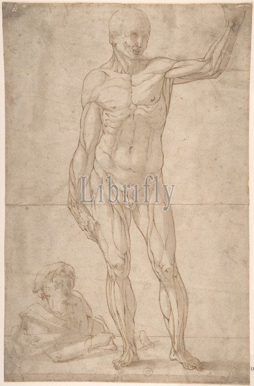 Study of Anatomy: A Youth Drawing an Ecorché of a Standing Man., 1550–1600, Pen and brown ink, brush and gray-brown wash, over traces of black chalk or leadpoint, 14-3/8 x 10 in. (36.5 x 25.4 cm), Drawings, Anonymous, Italian, 16th to early 17th century