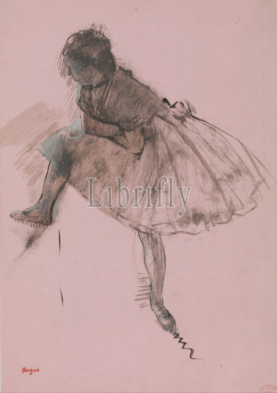 Study, Ballet Dancer, recto, Two Studies, Dancers, verso, ca, 1873, Black ink heightened, body color, prepared pink paper, 17 1/2 x 12 3/8, 44.5 31.4 cm, Drawings, Edgar Degas, French, Paris, 1834–1917, drawing, associated, larger group, studies, dated, Degas, famous, paintings, ballet dancers, confident free, brushstrokes, virtuoso depiction, shadow, front, dancer, left, foot, beautiful bluish, green, highlights, right side, showcase, artist, skill, draftsman