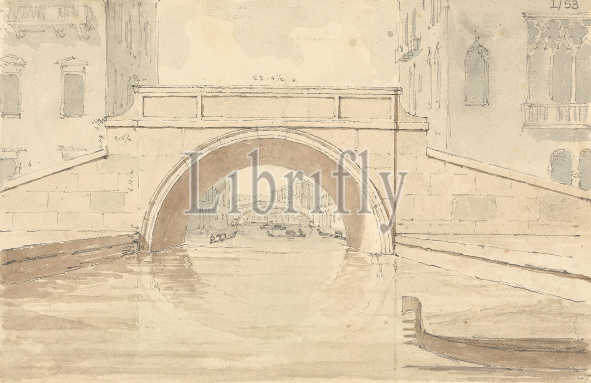 Study, Bridge, Sir Robert Smirke, younger, 1781–1867, British, 1802-1804, Watercolor, graphite, pen, brown ink, moderately thick, moderately textured, beige, wove paper, Sheet, Italy, Venice
