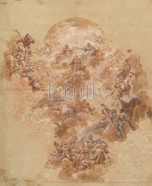 Study for a Ceiling Decoration: Coronation of the Virgin (recto); Female Head (verso), 1680, Red chalk, brush and brown wash, highlighted with white, on brownish paper (recto); red chalk study of a female head (verso), 18 1/16 x 14 5/8in. (45.9 x 37.2cm), Drawings, attributed to Giacinto Brandi (Italian, Rome 1621–1691 Rome), Crowded scenes with the apotheosis of saints were a popular subject for ceiling decorations in Roman churches of the seventeenth and eighteenth century. The outlines of an architectural ceiling surrounding this powerful large-scale composition drawing, or ‘modello,’ reveal that this design was intended for such a fresco painting