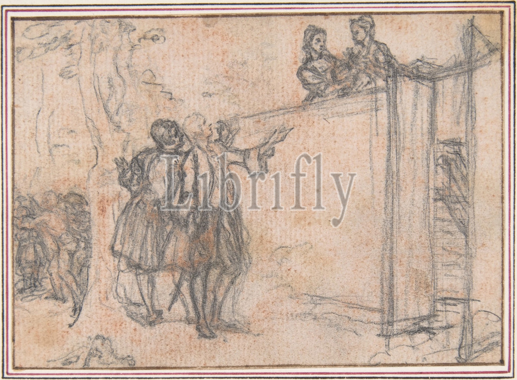 Study, Engraving, Songs, Opera, Flora, ca, 1737, Pen, blue, brown ink, black chalk, slight traces, red, 2 13/16 x 4, 7.2 10.1 cm, Drawings, Hubert François Gravelot, French, Paris, 1699–1773