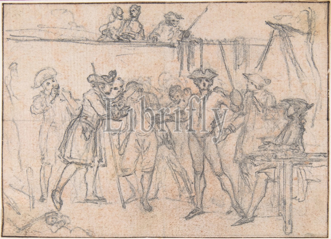 Study for an Engraving of 'Songs in the Opera of Flora', ca. 1737, Pen and blue and brown ink, graphite, with slight traces of red chalk, 2 13/16 x 3 15/16 n. (7.2 x 10 cm.), Drawings, Hubert François Gravelot (French, Paris 1699–1773 Paris)