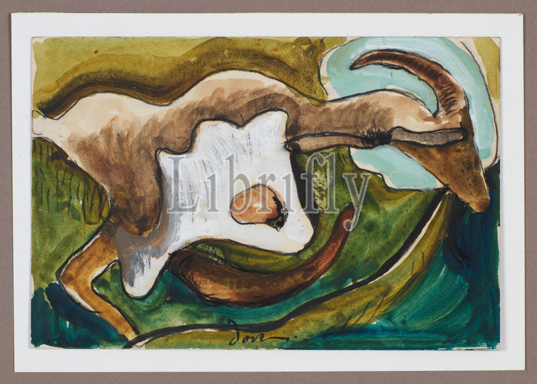 Study, Goat, ca, 1934, Watercolor, gouache, graphite, paperboard, 4 x 6, 10.2 15.2 cm, Drawings, Arthur Dove, American, Canandaigua, New York, 1880–1946, Huntington, watercolor, study, Dove, oil painting, title, Dove typically, worked, out, compositional arrangements, color schemes, medium, small scale, transferred, image, larger canvas, means, projector, magic lantern, copying tool, pantograph