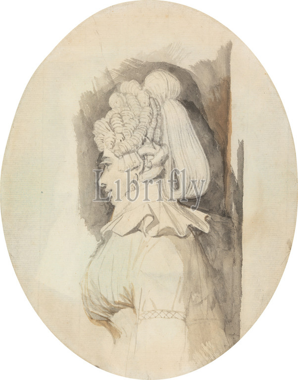Study of a Lady, Henry Fuseli, 1741–1825, Swiss, active in Britain (1766–70; 1779 on), undated, Graphite, gray wash, brown wash, and watercolor on medium, slightly textured, cream laid paper, Sheet: 9 1/2 x 7 1/2 inches (24.1 x 19.1 cm), earrings, genre subject, hands, newspaper, portrait, ruff, woman